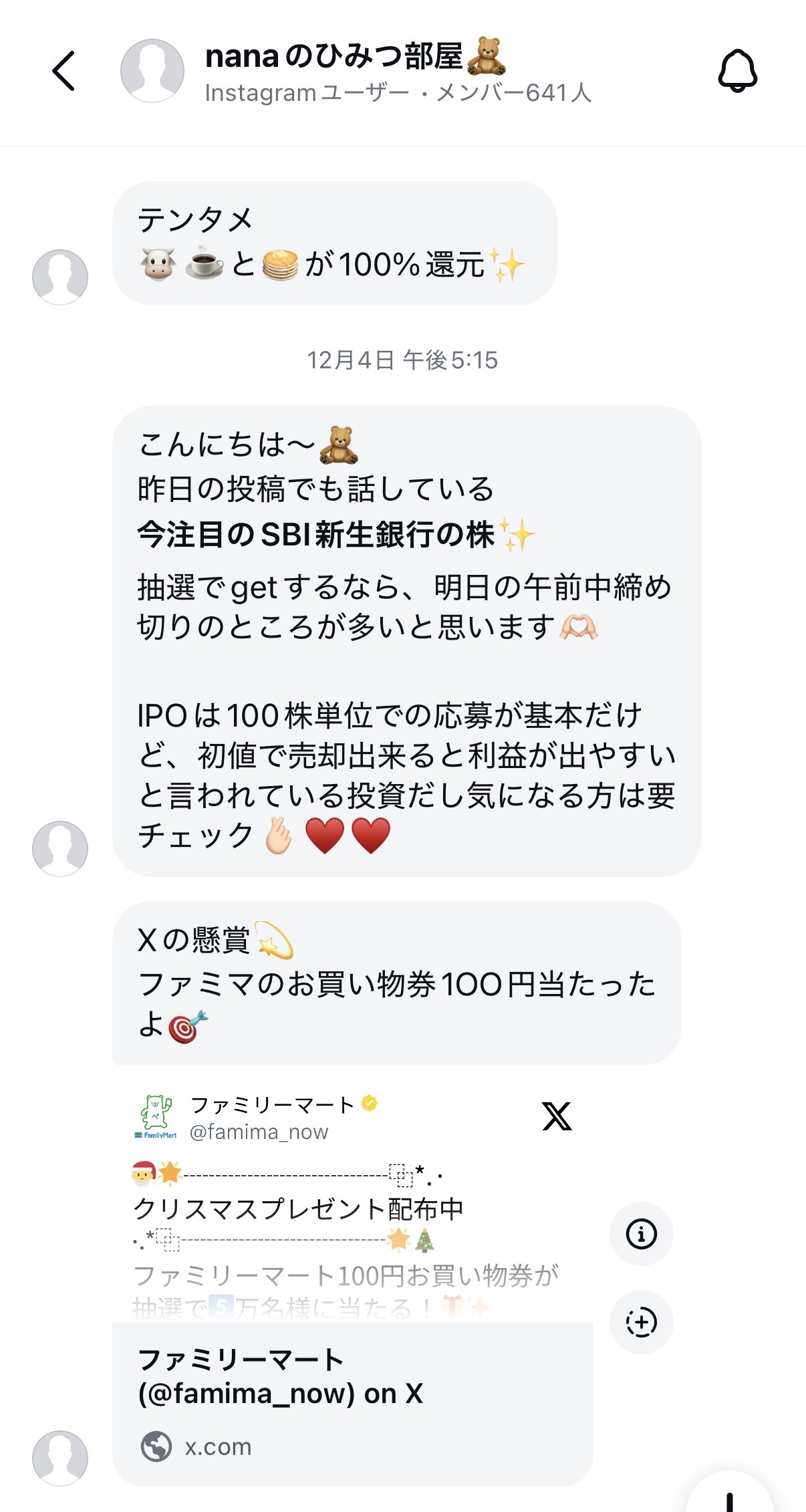 例えば、一斉配信チャンネルの「ひみつ部屋」「クラファン部屋」で話していたようなことはオープンチャットとXでお話しします🧸🎧
