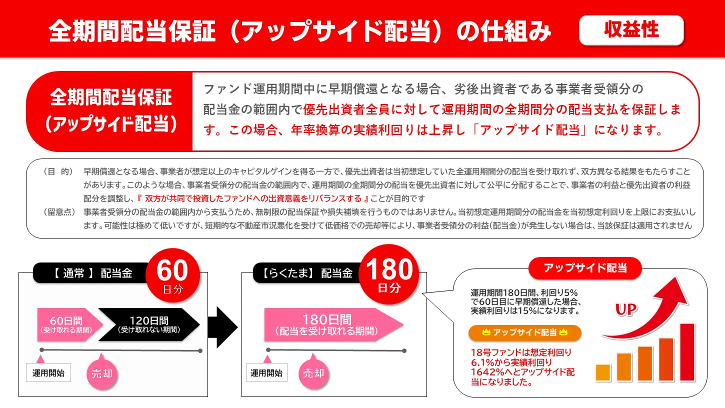 劣後出資とは、もし不動産価格が下がっても一定まではらくたまが負担するといったサービスです